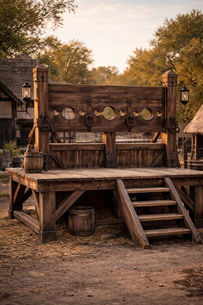 These are often made of two or more individual ones combined, raised on a stand. Unusually they are low, forcing the offender to stand, bent over at a painful ninety degrees. If the offender is sentenced to a long period, a support is often placed beneath their body (after a certain time) to prevent them collapsing and breaking the neck.